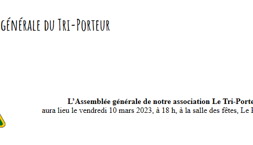 L’Assemblée générale de notre association Le Tri-Porteuraura lieu le vendredi 10 mars 2023, à 18 h, à la salle des fêtes, Le […]